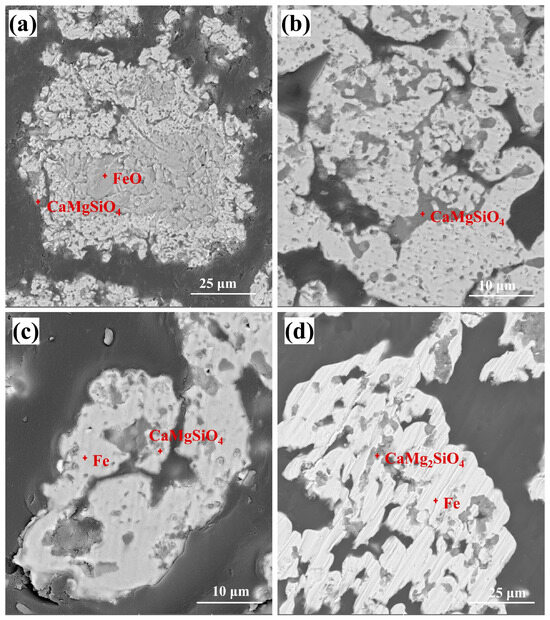 To further examine the reduction process, Figure 11 shows the SEM-EDS analysis of the products obtained by hydrogen reduction of magnetic concentrate under microwave irradiation at 750 °C, 850 °C, 950 °C, and 1050 °C. Note that for brevity, detailed EDS spectra of different spots are not provided. Obviously, there were multiple phases in the reduction products. With rising temperature, a greater number of Fe particles were observed in the absence of detectable FeO. The formation of CaMgSiO4 originated from the thermal decomposition of CaCO3, where the liberated CaO subsequently reacted with SiO2 in the presence of trace magnesium impurities. As indicated by the dotted circles in Figure 12, these impurities no longer remained scattered when the temperature increased.