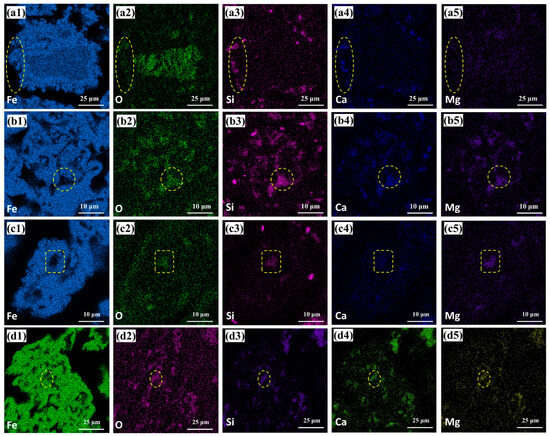 EDS mapping analysis of the products generated after hydrogen reduction of magnetic concentrate under microwave irradiation at different temperatures: (a1–a5) 750 °C, (b1–b5) 850 °C, (c1–c5) 950 °C, and (d1–d5) 1050 °C.