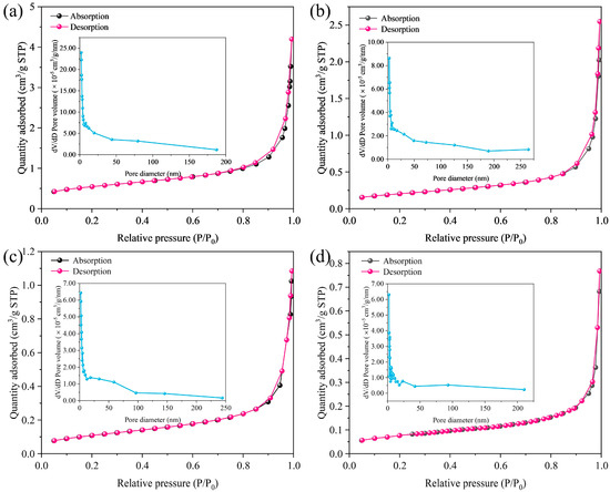 Nitrogen adsorption–desorption isotherms of the products obtained after hydrogen reduction of magnetic concentrate under microwave irradiation at different temperatures: (a) 750 °C, (b) 850 °C, (c) 950 °C, and (d) 1050 °C.