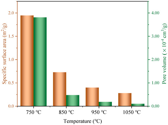 For elucidating the reduction mechanism, the specific surface areas and pore volumes of the reduction products were determined using the multi-point BET method and t method, respectively [32,33], as shown in Figure 14. As the temperature increased from 750 °C to 1050 °C, the specific surface area of the reduction product decreased from 1.946 m2/g to 0.2764 m2/g. Meanwhile, the pore volume declined from 3.81 × 10−4 cm3/g to 9.421 × 10−6 cm3/g. Note that at the temperature with the optimal reduction indexes (Figure 9), 950 °C, the two parameters were 1.767 × 10−5 cm3/g and 0.3961 m2/g, respectively. These changes indicated a more compact structure of the product with increasing reduction temperature, probably attributed to the continuous accumulation of metallic iron particles produced from stepwise reduction of iron oxides [34].