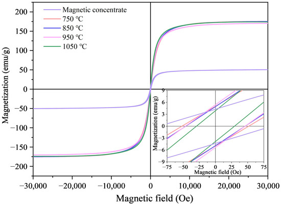 The magnetic properties of the reduction products could be evaluated by measuring MS and HC, as shown in Figure 15. The magnetic concentrate had limited magnetism before reduction, as revealed by its low Ms values. After reduction at 750 °C, its reduction product exhibited a much higher Ms value. As the temperature increased continuously, there were minor increases in Ms, consistent with the variation in the iron metallization degree. The other parameter, Hc, decreased from 52.1 Oe to 29.3 Oe, probably due to the growth of iron particles. Note that after reduction at 950 °C, the Ms and Hc of the product remained at 170.94 emu/g and 46.25 Oe, respectively.