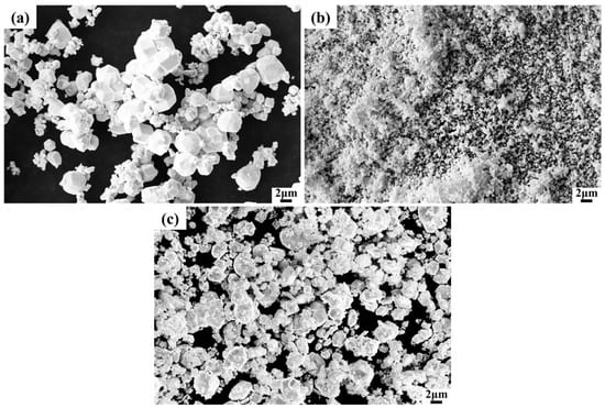 SEM images of the powders: (a) W powder; (b) HfC powder; (c) mixed powder.