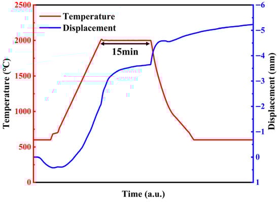 Tungsten powders (99.95%, 1–3 μm) and HfC powder (99.9%, 1–3 μm) were used to fabricate the composites. Four W-HfC composites with different HfC contents (5, 10, 15, and 20 wt%) were prepared and labeled as W-5HfC, W-10HfC, W-15HfC, and W-20HfC, respectively. Both powders were dry ball-milled by a ball milling machine using a ball-to-powder mass ratio of 4:1. The mixture was processed at a rotation speed of 300 rpm for 8 h under Ar, with intermittent pauses of 10 min after every 30 min of milling to prevent overheating. The ball-milling process used tungsten carbide balls. The microstructures of W powder, HfC powder, and the mixed powder are shown in Figure 1. The composite powders were consolidated by SPS (20T-6-IV, Shanghai Chenhua Technology Co., Ltd., Shanghai, China) in a graphite mold at 2000 °C for 15 min in vacuum under a pressure of 40 MPa. The heating rate was maintained at 100 °C min−1 up to the sintering temperature. Figure 2 shows the ram displacement and temperature curves during the ablation process. The sample size is 40 mm in diameter and 5 mm in thickness, and the relative densities of the composites were measured using Archimedes’ method.