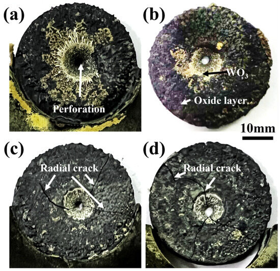 The high-temperature ablation behavior of W-HfC composites was investigated. Figure 3 reveals the post-ablation surface morphologies of four W-HfC variants subjected to 2800 °C oxy-acetylene flame testing. The ablation process involves synergistic thermomechanical loading from both extreme temperatures and high-pressure conditions induced by high-velocity gas flow scouring, resulting in coupled oxidative and erosive degradation [28]. Gas flow dynamics from the central impingement zone toward peripheral regions caused mechanical perforation at the sample core. Surface analysis identified a continuous oxide layer with localized yellowish oxidation products near the central region. While W-5HfC and W-10HfC specimens maintained structural integrity without discernible cracking, W-15HfC and W-20HfC exhibited radial crack propagation from the core to periphery, leading to catastrophic fracture.