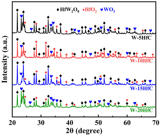 The primary oxidation product of W at high temperatures is WO3, while HfC predominantly forms HfO2 under similar conditions. WO3 and HfO2 can react via solid-state interactions to generate composite oxide HfW2O8 at elevated temperatures.