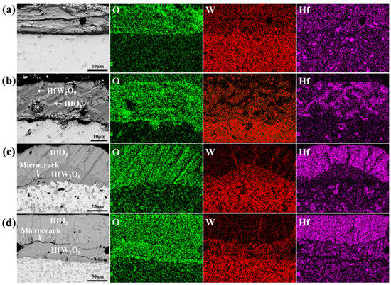 Figure 5 indicates that W-HfC composites with different HfC contents formed different oxide layer structures during the ablation process. EDS mapping reveals distinct phase distributions: W-5HfC primarily forms the composite oxide HfW2O8 with limited HfO2 particles. The oxide layer exhibits internal cracking, while the outer surface transforms into a granular structure under high-temperature and high-velocity gas flow scouring, indicating insufficient HfO2 formation to protect the matrix at low HfC additions. In contrast, W-10HfC develops a dense oxide layer comprising an HfW2O8 matrix uniformly reinforced with monolithic HfO2 particles. The synergistic combination of HfW2O8 (exhibiting negative thermal expansion) and HfO2 (exhibiting exceptional high-temperature stability and oxidation resistance) ensures tight interfacial bonding, resulting in optimal ablation resistance at 2800 °C. With increasing HfC content, W-15HfC and W-20HfC develop a stratified oxide structure where HfO2 aggregates into an outer protective layer, while HfW2O8 predominantly resides in the inner oxide region, with a small part diffusing outward into the HfO2 layer. The thermal expansion coefficient mismatch between HfO2 and HfW2O8 induces deleterious microcracks within the oxide layer, accelerating oxygen inward diffusion, thereby increasing the linear ablation rate and reducing the ablation resistance.