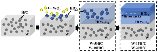 The proposed ablation mechanism of the composite material is illustrated in Figure 6. Tungsten initiates oxidation at approximately 400 °C, forming porous and loosely structured yellow WO3, which partially sublimates or melts during subsequent ablation. Subsequently, HfC particles oxidize under ablation temperatures to primarily generate blocky HfO2. For W-5HfC and W-10HfC composites, the resultant HfO2 reacts with WO3 at elevated temperatures to form HfW2O8, a composite oxide exhibiting negative thermal expansion behavior [31]. HfW2O8 demonstrates low thermal conductivity and enhanced thermodynamic stability under high-temperature oxygen-rich environments, effectively converting detrimental WO3 into a protective phase. HfW2O8 forms a dense barrier layer that encapsulates residual blocky HfO2 particles. The HfO2 phase contributes superior thermophysical properties, including a high melting point (2900 °C) and low thermal conductivity (1.5 W/m·K) [32]. The synergistic combination of this dense oxide structure and uniformly distributed HfO2 effectively impedes inward heat transfer and oxygen diffusion, thereby shielding the bulk W-HfC from further ablation damage. Consequently, moderate HfC additions (~10 wt%) optimize the ablation resistance of W-HfC composites.