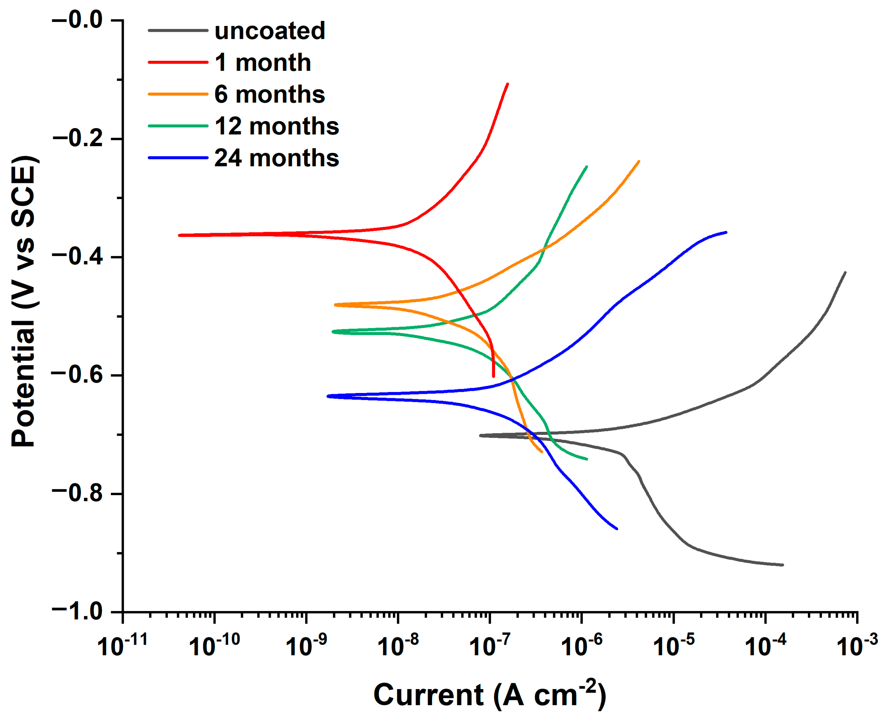 Immersion Time (Months) | Ecorr (V) | Ιcorr (μA cm−2) | CR (mm/Year) | Mass Loss (Grams) | η (%) |