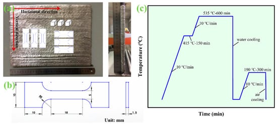 Physical drawing of WAAM 2319 aluminum alloy and schematic diagram of the sampling position for experimental testing (a), dimension of tensile specimen (b), and heat treatment process flow chart (c).