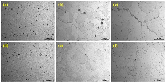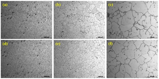 Microstructure (OM) of the specimen after the solution treatment: (a–c) the interlayer and (d–f) intralayer.
