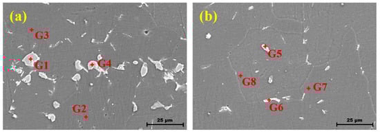 A further analysis of the scanning electron microscopy observations (Figure 5) and corresponding EDS results (Table 4) of the solid-state microstructure reveals that in the interlayer regions, larger secondary phase at locations G1 and G4 remain as the θ phase. In contrast, intralayer regions contain fewer residual θ phases, with most being strip-shaped phases rich in Fe and Mn (at locations G5 and G6). Additionally, the Cu content in the α(Al) matrix significantly increases to approximately 5.5–6.0% due to the dissolution of θ phases, higher than that in the as-deposited state.