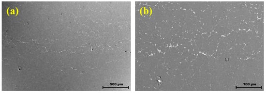 Microstructure (SEM) of the specimen after the aging treatment: (a) the low magnification and (b) the high magnification.