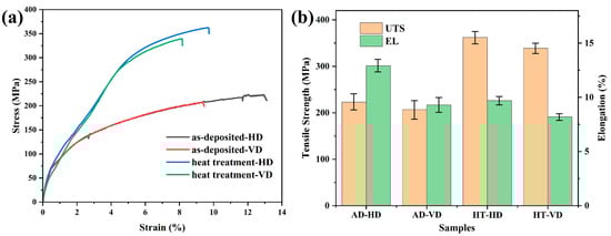 Tensile test results of the specimens in the deposited state and after heat treatment: (a) stress–strain curves and (b) histogram of average tensile strength and elongation.