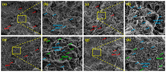 Fracture morphologies of the different specimens: (a–d) as-deposited sample images in the (a,b) horizontal and (c,d) vertical directions; (e–h) aging-state sample images in the (e,f) horizontal and (g,h) vertical directions.