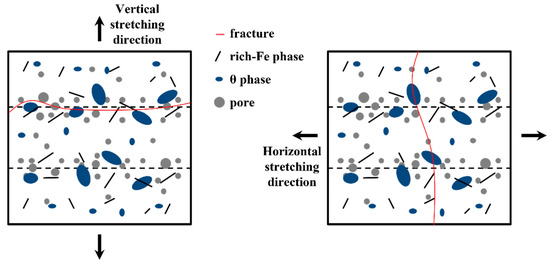 Based on the above analysis, a schematic diagram of the differences in mechanical properties in different directions of WAAM 2319 aluminum alloy as shown in Figure 10 is drawn. When the specimen is stretched vertically, the weak zone is perpendicular to the direction of the applied force. After entering the yield stage, micro-cracks are generated within the weak zone and rapidly aggregate, leading to macroscopic fracture. Therefore, the plasticity and tensile strength of the specimen in this direction are relatively low. When the specimen is stretched horizontally, the weak zone is parallel to the direction of the applied force. After entering the yield stage, the generated micro-cracks are isolated by the areas with better plasticity within the layer, and the crack propagation is hindered, delaying the macroscopic fracture process. Therefore, the plasticity and tensile strength are higher than when the specimen is stretched vertically.