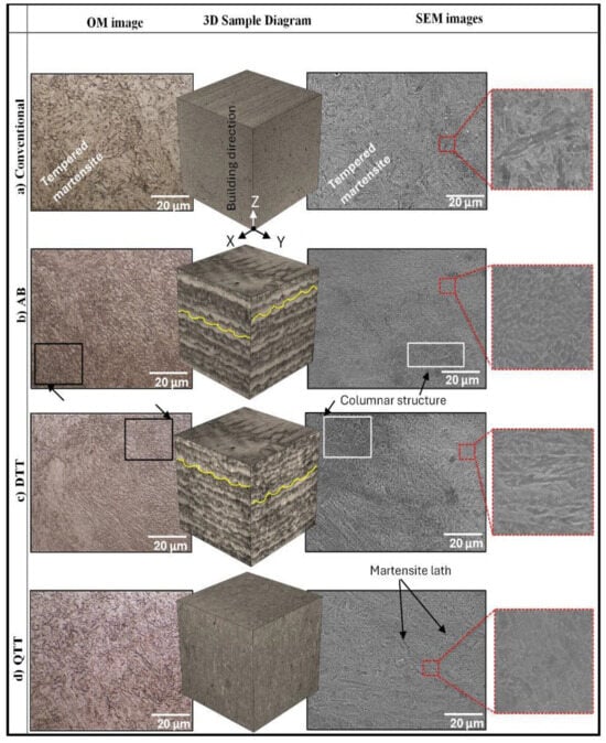 - Omidi, N.; Iltaf, A.; Houria, M.; Jahazi, M.; Barka, N.; Belzile, C. Enhancing Mechanical Properties of Additively Manufactured H13: A Two-Step Approach Integrating Processing Parameters Optimization and a Tailored Heat Treatment. Met. Mater. Int. 2024, 31, 1286–1312. [Google Scholar] [CrossRef]