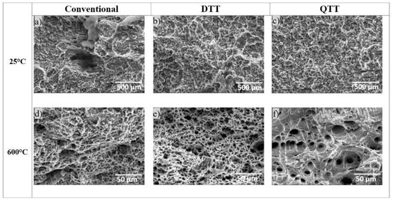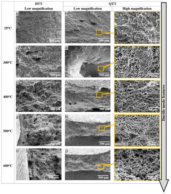 - Fractographic analysis revealed a progressive transition from mixed mode to fully ductile fracture in AB and DTT samples as temperature increased, while QTT samples displayed ductile fracture features at all tested temperatures. This indicates that the QTT condition had undergone a higher degree of tempering, leading to a softer microstructure even at lower temperatures.