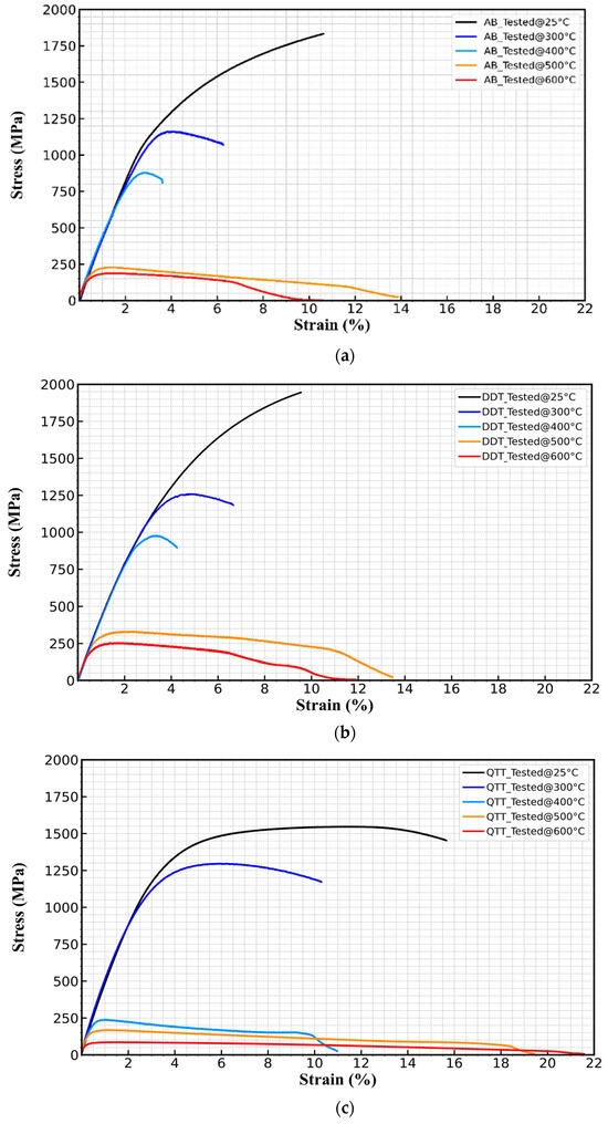 - The DTT configuration exhibited improved mechanical performance compared to the AB condition, particularly at elevated temperatures. At 400 °C, both DTT and AB samples retained approximately 80% of their room-temperature yield strength, demonstrating notable thermal resistance. This enhancement in the DTT sample is attributed to the double tempering process, which promoted microstructural homogeneity and carbide precipitation, thereby mitigating the effects of thermal softening.