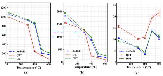 - In contrast, the QTT configuration showed a significantly sharper decline in mechanical strength with increasing temperature, retaining only ~24% of its initial yield strength at 400 °C. This unexpected softening behavior suggests that conventional heat treatment protocols may not be directly transferable to LPBF-processed materials without modification, due to their unique microstructural characteristics and thermal history.