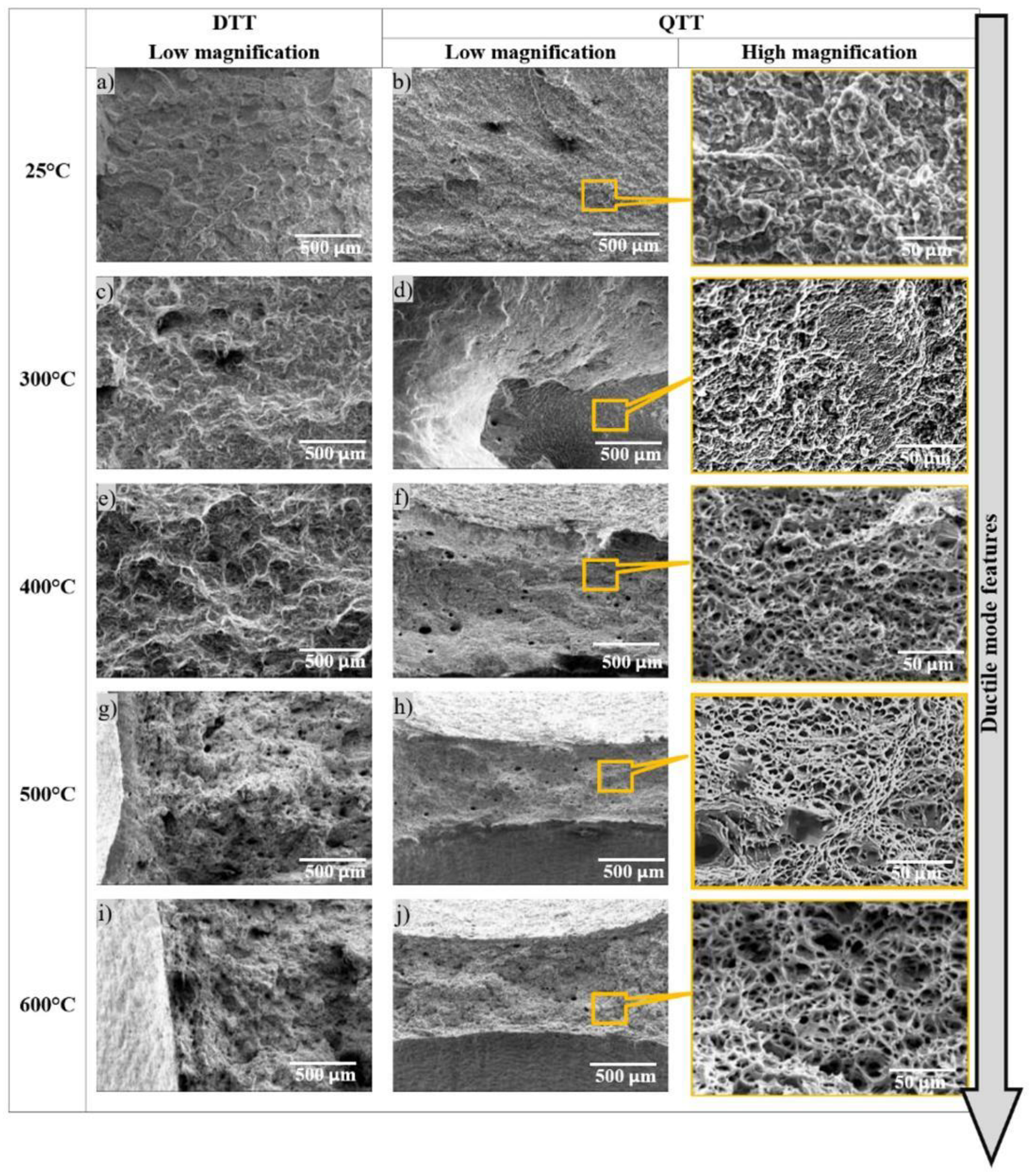 Figure 4 illustrates the temperature-dependent transition in fracture modes from room temperature to 600 °C. Low-magnification images facilitate comparison between DTT and QTT configurations, while a high-magnification QTT image highlights detailed fracture features.