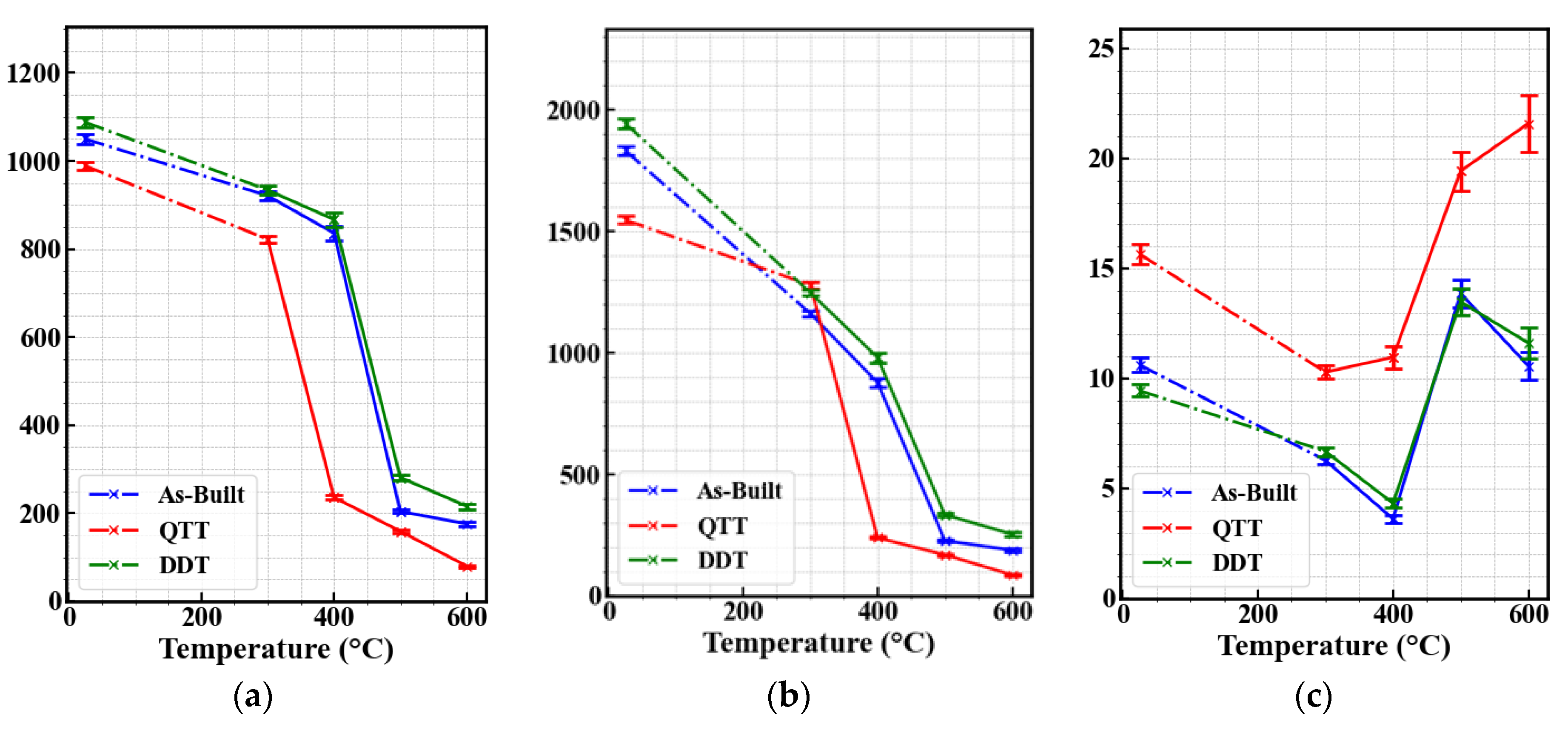 For the AB material, depicted in Figure 7a, YS decreases slightly by 11.6% at 300 °C (from 1071 MPa at 25 °C to 947 MPa) and remains relatively stable at 400 °C, decreasing by only 21.9% compared to room temperature. However, strength drastically declines at higher temperatures, by 81% at 500 °C and a further 84% at 600 °C, respectively. DTT follows the same trend but retains higher mechanical strength than the AB material, maintaining a YS of 867 MPa at 400 °C, about 80% of its value at room temperature. In contrast, the QTT configuration, despite having comparable initial room-temperature strength, is more prone to strength decay as the temperature increases. Yield strength at 300 °C decreases by 16.9%, followed by a severe drop of 76.1% at 400 °C, indicating less thermal stability compared to AB and DTT at this temperature. By 600 °C, QTT strength declines by about 92% relative to room temperature. As the tensile test temperature increases, especially at 500 °C and above, all configurations exhibit a decline in strength.