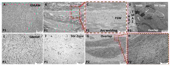 - The metallurgical examination revealed the characteristic microstructures associated with each welding process across all conditions. In the overlap zone, the cast structure originally produced by arc welding was altered by the friction-stirring action, resulting in a fine, equiaxed grain structure typical of friction stir welding.