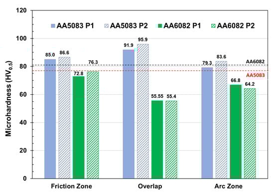 - The AA6082-T6 joints showed a reduction in hardness across all welded zones compared to the base material, with the overlap zone presenting the lowest value (55.6 HV). The highest joint efficiency achieved in tensile testing was 66.7%. This performance is associated with the dissolution of strengthening precipitates caused by the thermal and mechanical effects of the FSW process.