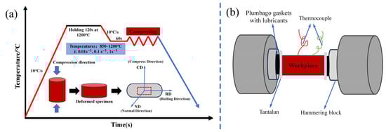 The material chosen for this study was 45CrNi steel, with its chemical constitution presented in Table 1. A bar with a dimension of Φ160 mm treated by a continuous casting and continuous rolling process was firstly prepared, and the rod was sectioned into cylindrical specimens (Φ8 mm × 12 mm) using wire electrical discharge machining. All surfaces, including the two ends, were then ground and polished to achieve a mirror-like finish. The compression tests were performed on a Gleeble-3800D thermo-mechanical simulator (Dynamic Systems Inc., Poughkeepsie, NY, USA), and the specimens were heated uniformly to 1200 °C at a heating rate of 10 °C/s, followed by a 2 min isothermal hold. Afterward, the specimens were cooled uniformly at 10 °C/s to target deformation temperatures spanning 850–1200 °C. Then, a set of high-temperature compression tests were conducted at strain rates of 0.01, 0.1, and 1 s−1, with 50% deformation applied prior to rapid quenching, and the experimental workflow is illustrated in Figure 1a. The sample assembly diagram during the experiment is shown in Figure 1b. Since the high hardenability of the studied 45CrNi steel was induced by the addition of a series of alloying elements including C, Mn, Cr, Ni, etc., the final transformation product was confirmed to be martensite after a treatment of hot compression followed by water quenching, and the size of morphology of the parent austenite during hot deformation could be retained at ambient temperature, which could provide favorable conditions for investigating the DRX behavior of the studied 45CrNi steel during the hot deformation process. After the compression experiment, metallographic images of the specimens were obtained following etching with a trinitrophenol solution, and the true stress–true strain responses of the investigated steel under uniaxial compression were recorded for subsequent data analysis.