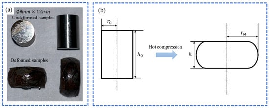 Changes in sample shape. (a) Sample photo before and after hot compression; (b) Schematic diagram of compressed sample.
