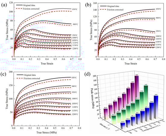 Comparative analysis of friction-adjusted versus raw true stress–strain characteristics and critical stress in 45CrNi alloy steel. (a) , (b) , (c) , (d) peak stress distribution.