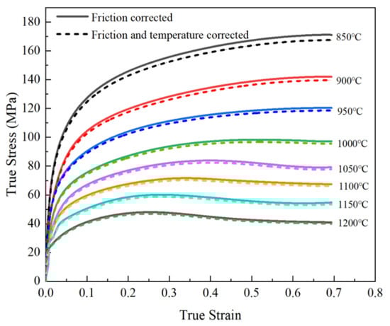 When the compression speed of the sample is fast during hot compression, the heat generated by plastic deformation often cannot be dissipated in time, resulting in the sample heating up, that is, the adiabatic temperature rise effect, and the actual deformation temperature is higher compared to the set temperature. When the strain rate is low below 1 s−1, the effect of adiabatic temperature rise can be ignored, but this effect is more pronounced at high strain rates [,,]. So, it is necessary to perform temperature correction on the flow stress curve. In this study, a temperature rise formula combined with interpolation is further used to perform temperature correction on the flow stress curve after friction correction.