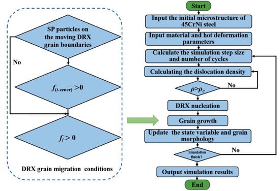 The optimized set of material parameters employed for the SP-CA simulation is presented in Table 3, and the flowchart of the SP-CA model is illustrated in Figure 5. Initially, the calculated results of the normal growth of austenitized grains and SP particles are used as the initial microstructure for the CA simulation. Then, the material parameters and hot deformation parameters are input into the model. The initiation and development of DRX are activated by the SP-CA model, which utilizes dislocation density to model microstructural changes during the hot deformation of 45CrNi steel. The core parameters associated with microstructural transformation and thermal processing, encompassing stress–strain plots, DRX extent, and mean crystallite dimensions, are computed by the CA framework. In addition, the MnS inclusions are the common second-phase particles in medium carbon alloy steel. This type of particle is usually formed by the combination of the residual S element in steel and the Mn element, and has extremely high thermal stability, with a dissolution temperature of up to 1610 °C. Therefore, MnS particles can exist stably throughout the entire hot deformation temperature range of 850–1200 °C and have a significant pinning effect on the grain boundaries, effectively suppressing austenite grain growth. Hence, the MnS inclusions distributed with the average size scale of 200 nm to 3000 nm and with a volume fraction less than 0.12% are adopted in the establishment of the SP-CA model in this study.