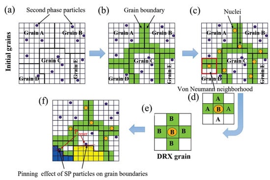 Schematic diagram of SP-CA simulation process: (a) SP particles and initial austenite of DRX, (b) grain boundary, (c) recrystallized nucleation, (d) Von Neumann neighborhood, (e) growth of recrystallized grains, (f) pinning effect of SP particles on grain boundaries.