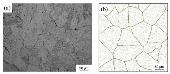 Figure 7 shows the initial austenite microstructure heated to 1200 °C and the corresponding initial austenite microstructure simulated by the SP-CA model. The black dots in Figure 7b represent SP particles. The average grain size of the experimentally measured initial austenite is determined to be approximately ~159.63 μm, while that of the initial austenite achieved through the SP-CA model is approximately ~163.24 μm. It could be confirmed that the SP-CA model’s predictions regarding austenite structure and grain size exhibit strong agreement with experimental data from the primary austenite. The SP-CA model in this study is primarily established based on the single-pass thermo-compression experiment, indicating the model is only applicable to investigating the microstructural evolution during DRX, but not to static recrystallization (SRX) conditions. The applicability of the CA method on the SRX conditions should be further considered from the perspective of recrystallization kinetics.