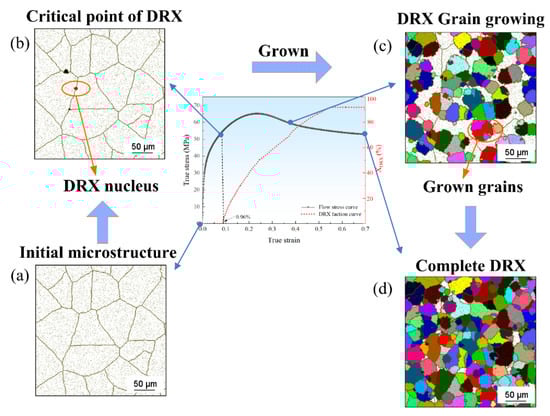 Figure 8 presents the microstructural evolution at different strains simulated by the SP-CA method under a deformation temperature of 1050 °C and a strain rate of 0.1 s−1, where distinct grain colors indicate different crystallographic orientations of the DRX grains and black dots represents SP particles. When the alloy is not in deformation, the DRX cannot occur due to the low dislocation density feature inside the grain and the lack of sufficient activation energy, and the initial grain size of austenite remains large, as shown in Figure 8a. When the strain is increased to the critical strain for DRX with 0.092, the volume fraction of DRX simulated by the SP-CA method is 0.96% as shown in Figure 8b, indicating that DRX begins to occur at the initially simulated austenite grain boundaries. When deformation continues, a significant increase in recrystallization nucleation sites can be clearly observed when the strain reaches 0.35. Meanwhile, the newly formed recrystallized grains begin to grow, as shown in Figure 8c. At this stage, the original microstructure of the 45CrNi steel is gradually replaced by recrystallized grains, and the DRX volume fraction increases to 66.5%. When the strain reaches 0.693, the DRX process is essentially complete, with a DRX volume fraction of 98.2%. Furthermore, comparative analysis between Figure 8a,d clearly demonstrates uniform grain growth after DRX and significant refinement of the recrystallized grain microstructure, which is manifested as fine grain strengthening. The above investigation results indicate that the SP-CA method could be applied to describe the nucleation, grain growth, and steady-state processes of DRX during hot deformation in regard to the studied 45CrNi steel.