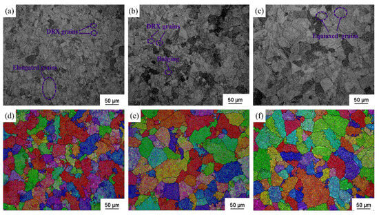 OM maps and EBSD-reconstructed maps of parent austenite of the studied 45CrNi alloy at strain rate of , strain of 0.693, and different hot deformation temperatures of (a,d) T = 1050 °C; (b,e) T = 1100 °C; (c,f) T = 1150 °C.