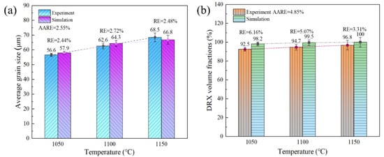 Data comparison and error analysis of studied 45CrNi steel achieved at strain rate of , strain of 0.693, and different deformation temperatures. (a) Average grain size and error diagram; (b) DRX volume fraction and error diagram.