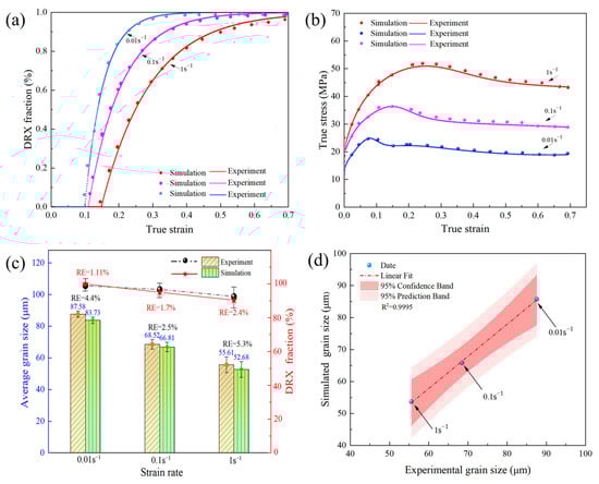 Comparison of experimental and SP-CA model simulation results at 1150 °C under different strain rates: (a) DRX volume fraction, (b) flow stress curve, (c) comparison of experimental and simulated values of grain size and DRX volume fraction of the parent phase, (d) comparison of average grain size values.
