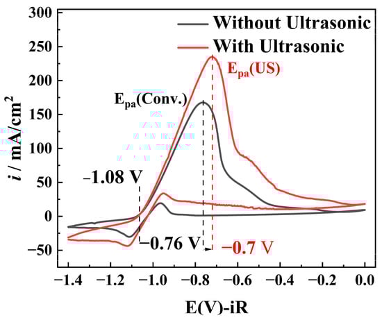 - Mass transfer intensification: The cavitation microjet generated by ultrasound has been shown to enhance the diffusion process. This acceleration of the electron transfer has been demonstrated to increase the peak current from 165.9 mA/cm2, to 234 mA/cm2. Furthermore, the microjet has been observed to destroy the mass-transfer boundary layer and to promote the dissolution of passivation products, with the oxidation peak potential increasing from −0.76 V to −0.70 V, which resulted in a weakening of the passivation.