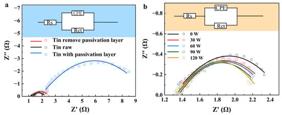 - Passivation suppression: Ultrasound effectively removes the passivation layer on the surface of the tin sheet through the action of micro-jets generated by cavitation. Consequently, the charge transfer resistance (Rct) decreases from 8.09 ± 0.01 Ω to 1.15 ± 0.01 Ω. The removal of the passivation layer by ultrasound reduces the activation barrier.