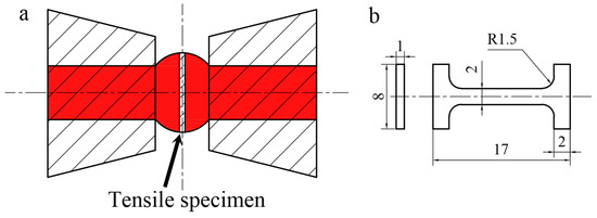 The sampling point and dimensions of the micro-tensile samples are shown in Figure 2. Micro-tensile tests were carried out at room temperature on an Inspekt Table 3 KN model universal testing machine (Hegewald & Peschke, Meß- und Prüftechnik GmbH, Nossen, Germany) with an extension rate of 0.3 mm/min, which fell within the quasi-static tensile range specified in the ASTM standard. The yield strength was determined by an offset stress of 0.2%.