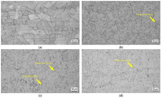 The metallographic sample cut from the cross-section of the thermocouple was prepared and etched at a 4% volume of Nital solution and then observed with an axiover-200mat optical microscope (OM) (Carl Zeiss AG, Oberkochen, Germany). The quantitative results of the twins were found using image-pro plus software version 6.0, and at least 10 fields of view were measured for each sample. The grain size could be calculated with the transversal method. The transversal method is a metallographic analysis approach that involves drawing test line segments of known lengths on a metallographic image, counting the number of cross-sectional points where they intersect with the boundaries, and calculating the average grain size by dividing the length of the total segments by the total number of cross-sectional points. Moreover, the misorientation of the samples at the austenite grain boundaries and twin boundaries were analyzed with a Hitachi S-3400 scanning electron microscope (Tokyo, Japan) using electron backscatter diffraction (EBSD), and the fraction of the boundaries could be obtained directly. The metallographic samples were electropolished in a solution of 85% alcohol, 10% perchloric acid, and 5% glycerinum. A JEM-2010 transmission electron microscope (TEM) (JEOL, Tokyo, Japan) was used to characterize the morphology of the dislocations and twins. The TEM samples were obtained by cutting thin slices parallel to the metallographic sections, and a small punch was used to cut discs 3 mm in diameter, which were then thinned via electropolishing. Electropolishing was performed at room temperature and a voltage and current of 25 V and 55–65 mA, respectively, using a 7% perchloric acid/glacial acetic acid mixture. Furthermore, the dislocation density of each sample was obtained using quantitative analysis of X-ray diffraction (XRD). The XRD spectrum was obtained by using a Rigaku D/max-2500/PC diffractometer (Tokyo, Japan) with a scanning angle (2θ) range of 20–100° and a step size of 0.02°.