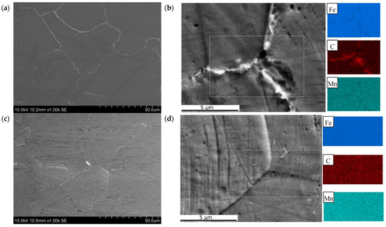 The microstructures observed via SEM of the different Mo content samples are shown in Figure 6. It can be seen that when the Mo content was 0.02 wt.%, a large amount of carbides appeared at the grain boundaries (Figure 6a). The EDS analysis indicated that the grain boundary carbides were formed by the segregation of C (Figure 6b). According to the results of the mapping scanning, it can be considered that the carbide was (Fe,Mn)3C. When the Mo content increased to 0.30 wt.%, the grain boundary carbides were significantly reduced, the degree of segregation of C at the grain boundaries was significantly alleviated, and the austenite grain boundaries became significantly finer (Figure 6d).
