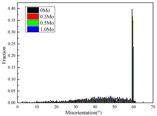 Distribution of grain boundary misorientation for different Mo content steels.