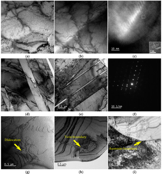 The micro-substructure morphology of the typical Mo content samples under a TEM is shown in Figure 9. As can be seen in Figure 9a–c, there were no obvious precipitated phases on the austenite microstructures of the samples with different Mo contents. After high-resolution treatment, M23C6 could be observed precipitating on the Mo-enhanced samples. As can be seen in Figure 9d–f, with the increase in Mo content, the morphology of the twin evolved from long and strip-like to short and rod-like. Thus, the fraction of the twin boundaries gradually decreased. The diffraction pattern indicated that this subarea was a twin. As can be seen from the dislocation morphologies and the dislocation movement shown in Figure 9g–i, dislocations accumulated at the twin boundaries and austenite grain boundaries, indicating that both twin boundaries and austenite grain boundaries can impede the movement of dislocations.