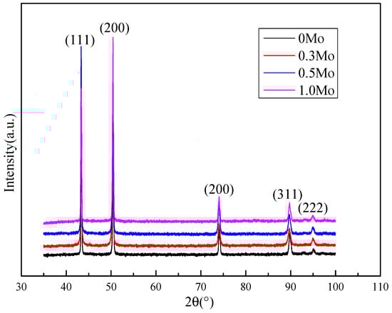 The XRD characteristics of the samples with different Mo contents are shown in Figure 10, indicating that the microstructure of each sample was single-phase austenite. Carbides or precipitates were not detected due to their extremely low contents. The quantification results for the dislocation density are shown in Table 3. With an increase in Mo content, the dislocation density gradually increased, which was due to the mechanism by which Mo inhibited recovery and recrystallization.