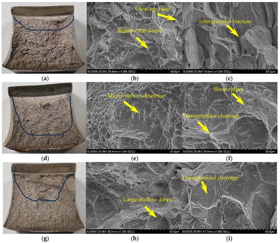 SEM micrographs of fracture surface for 0Mo (a), 0.3Mo (d), and 1.0Mo (g) samples and further identification with high magnification of the fibrous areas (b,e,h) and radiating areas (c,f,i).