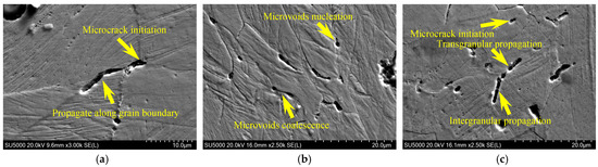 The secondary crack morphology of the typical Mo content samples is shown in Figure 12. Under significant deformation, secondary cracks in the 0Mo sample initiated at and expanded along the grain boundaries. This was related to the presence of a large amount of carbides at the grain boundaries of the 0Mo sample, which led to grain boundary embrittlement. In the 0.3Mo sample, multiple microvoids nucleated at the grain boundaries, and adjacent microvoids grew and coalesced, indicating that the overall deformation was distributed to each grain. The 1.0Mo sample simultaneously possessed the characteristics of the 0Mo and 0.3Mo samples. Microcracks initiated at the grain boundaries propagated intergranularly or transgranularly, indicating that the grain boundaries had a limited hindrance toward crack propagation.