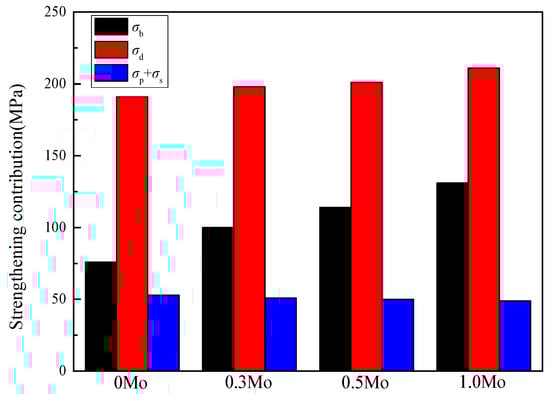 In addition to the aforementioned strengthening mechanisms, the sum of other individual strengthening contributions, σs + σp, was approximately the same for all the steels considered (Table 5). The increased Mo content led to decreases in the grain size and increases in the dislocation density, which in turn may result in enhanced strengthening contributions. However, due to the control range of the Mo content being at a relatively low level of 0~1.0 wt.%, the precipitates were not obvious, and the solid solution of Mo was relatively low, resulting in no significant changes in precipitation strengthening or solid solution strengthening. As a result, the overall YS increased with increasing Mo contents.