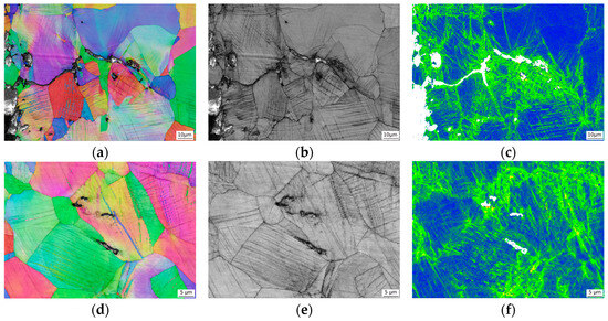 The EBSD results of a typical intergranular fracture and transgranular fracture in the 0Mo and 0.3Mo samples: inverse pole figure (a,d), band contrast maps (b,e), and kernel average misorientation maps (c,f).